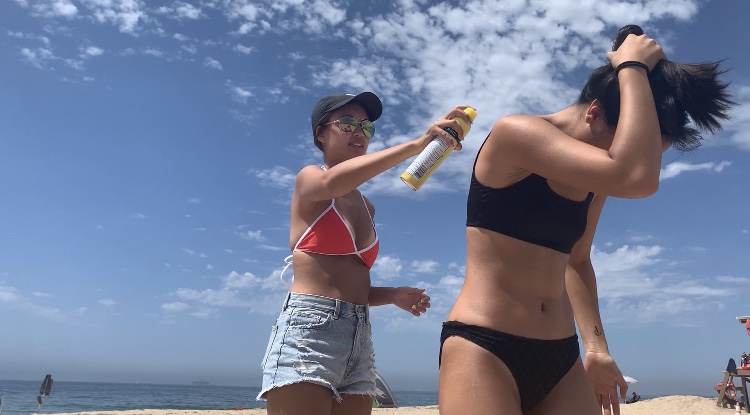 Sunglasses pictured in the sand at Sunset Beach, CA on a beautiful 70° weather day.Javalin Cummings (left) applies sunscreen on Ellie Delano (right). Ellie stated, “I don’t want to get sunburnt,” and asked Javalin to spray her back with sunscreen.The boys, Dylan Searle (in the hat) and Lucas Kim (in the pink shorts), relax while soaking up some sun. Roommates, Alex Bourne (left) and Lucas Kim (right), decided to have a friendly wrestling match on the beach. Alex came out as the winner in the end.After wrestling, Alex Bourne began to throw a football. Not pictured, Lucas Kim catching the ball.Lauren Schultz (left) and Javalin Cummings (right) step in the ocean to boogie board. Javalin from Arkansas stated that the water was cold.The Pacific Ocean pictured as the day was ending, giving peaceful vibes as we left the beach.